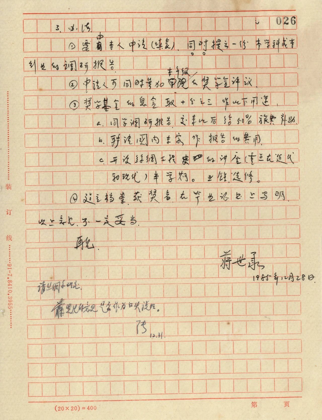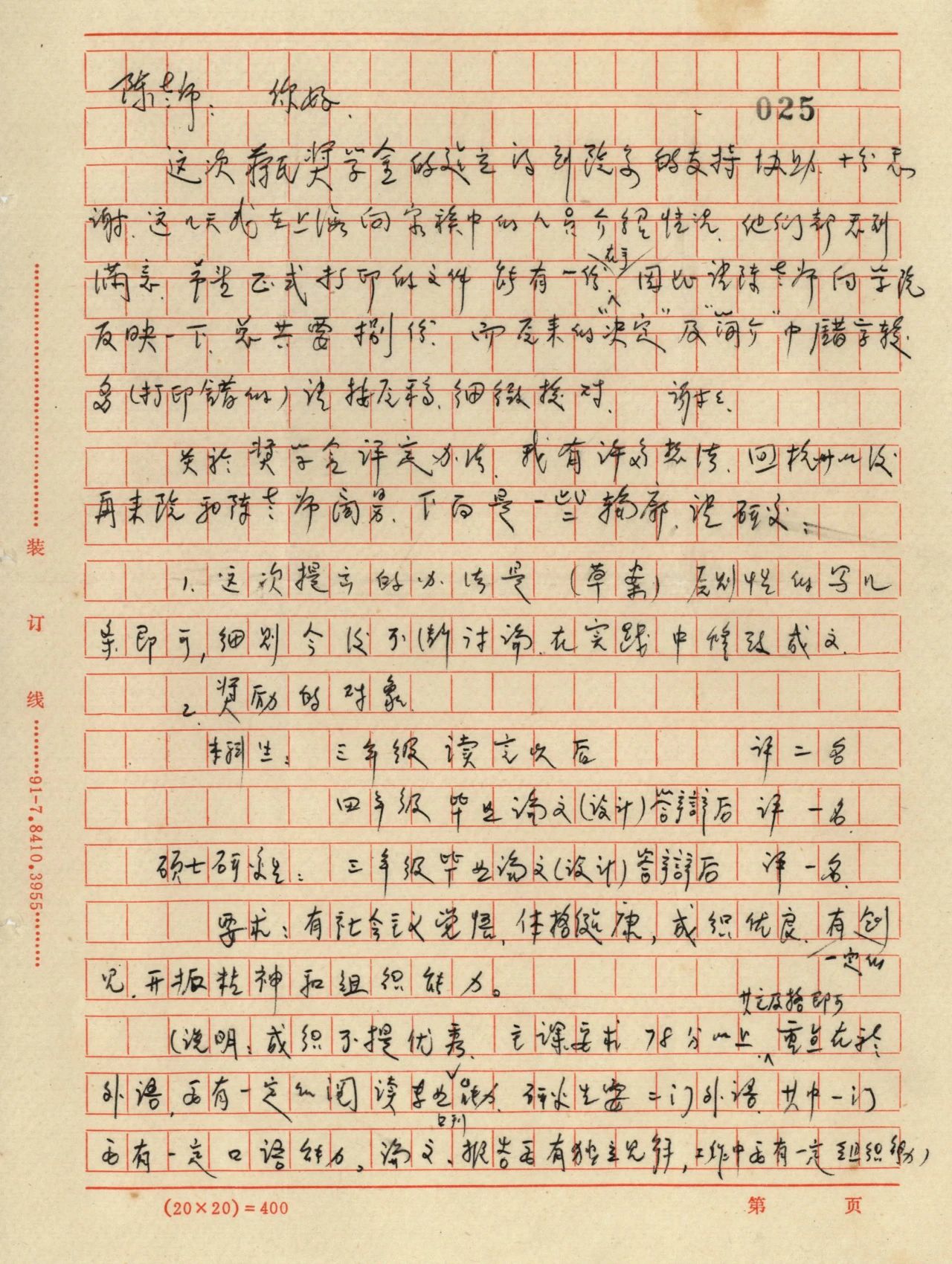 当年,蒋世承先生针对这笔奖学金如何发放,曾专门写过一封信。在泛黄的信笺中,他亲笔写下对奖励对象的要求:本科生在大三、大四的学生中评选,大四学生要完成毕业论文(设计)答辩,研究生在毕业论文(设计)答辩后进行评选。要求参评对象“有社会主义觉悟,体格健康,成绩优良,有一定创见、开拓精神和组织能力。”
