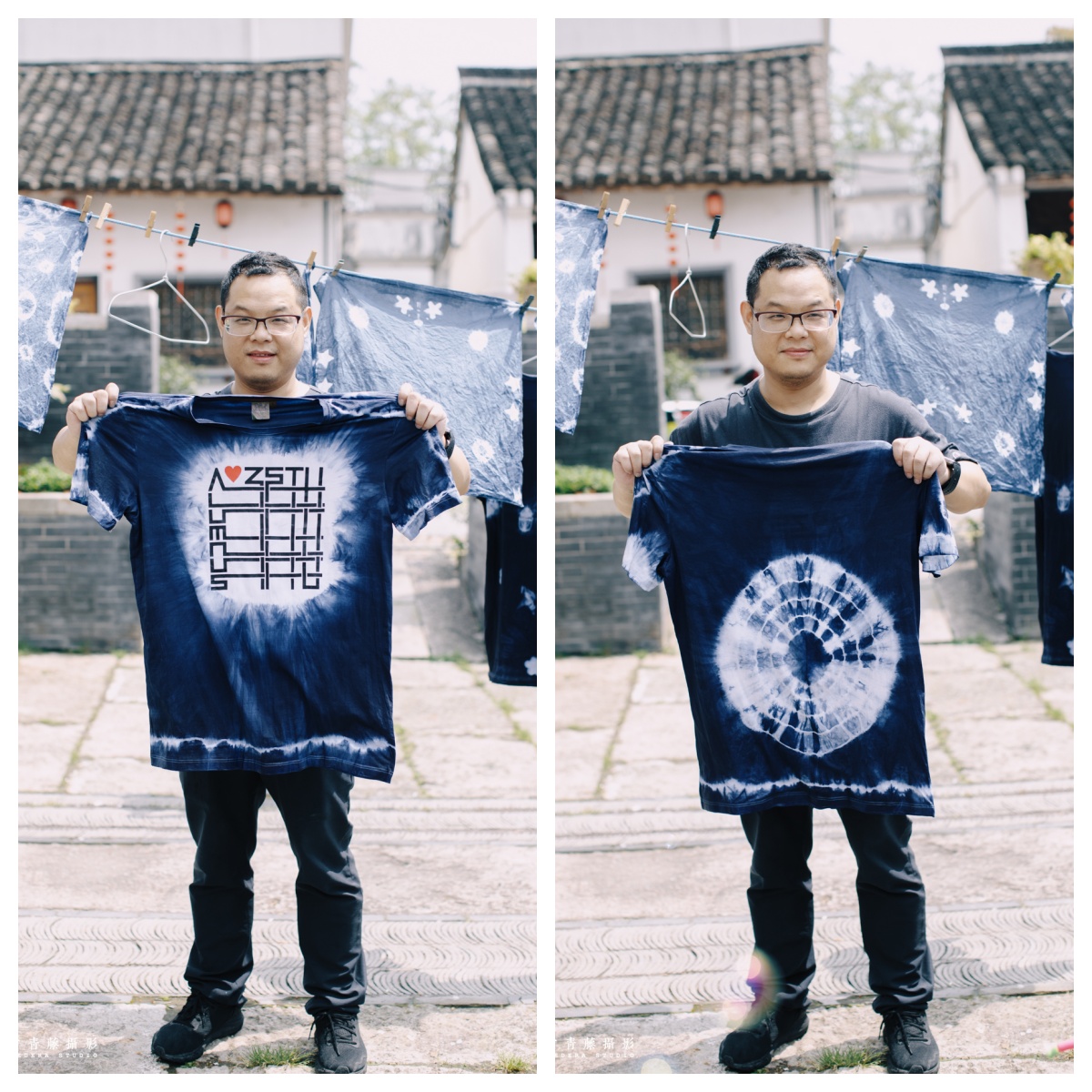 扎染不仅让孩子们沉浸其中,现场的校友爸爸妈妈们也跃跃欲试。其中,尤数楼谭杰会长最为起劲。他对当天的理工校友会文化衫打起了主意。在一番看似随意实则精心的捆捆扎扎后,他小心翼翼地将其浸入染缸。作品完成之后打开的那一刻,现场都沸腾了,简直美得不可方物啊!这件独属于自己的作品值得永久珍藏。