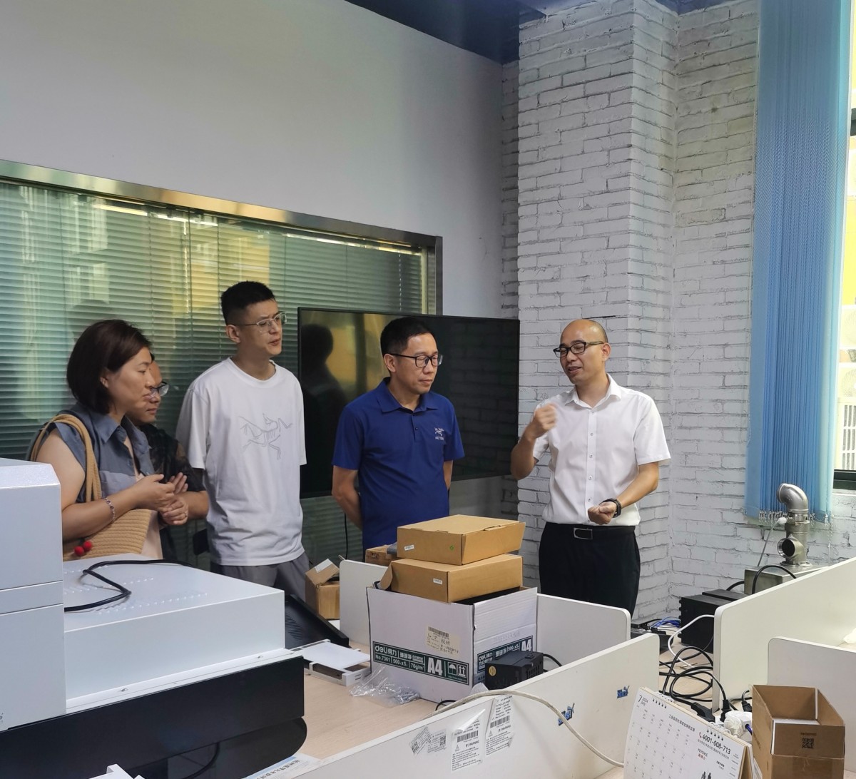 在参观了墨攻的实地工作后,我们在会议室进行了简单的会谈,除浙江理工大学机械控制学院张华老师外,会谈还荣幸的邀请到了浙江理工大学义乌技术转移中心主任王春雨老师和鼠打猫互动SOCIAL MORE创世人张弛。