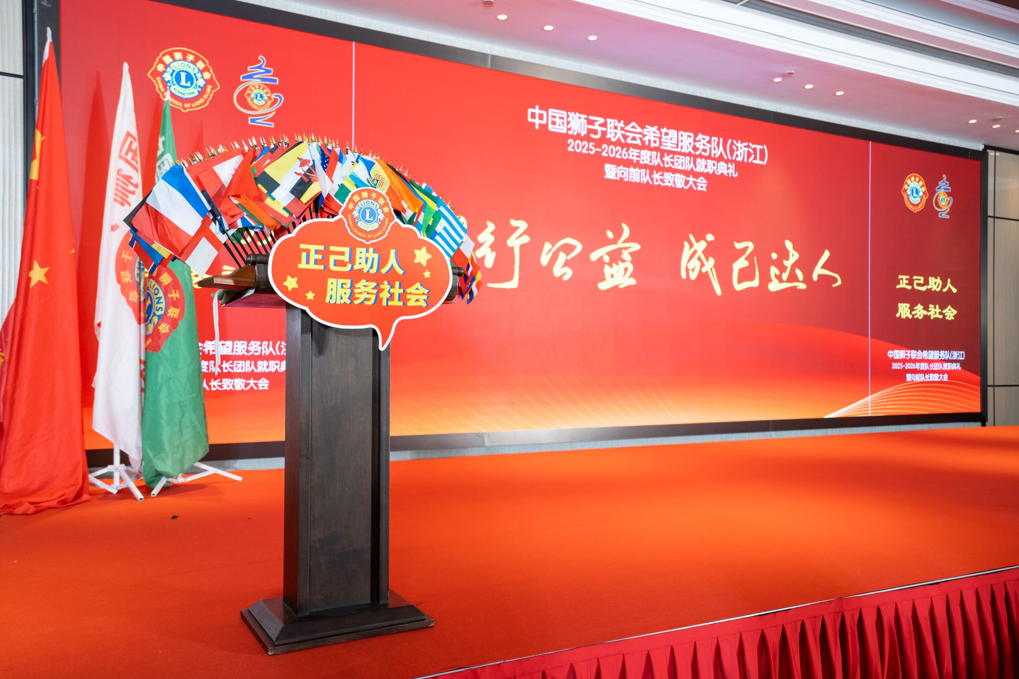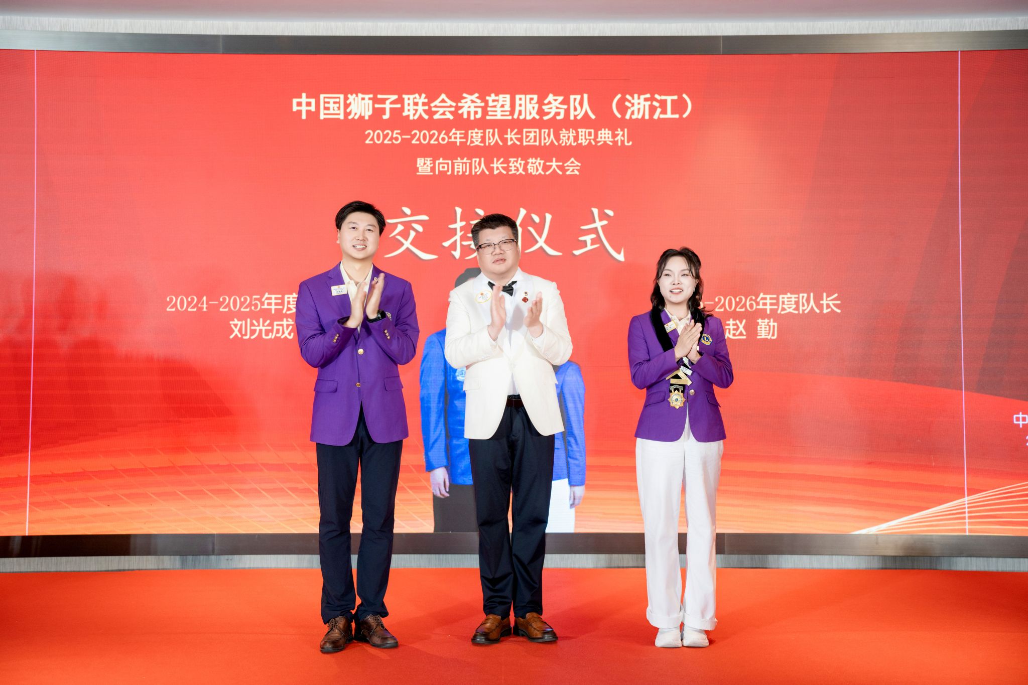 典礼现场,庄严而热烈的氛围中,在浙江代表处主任邵卫平及各位领导狮友们的见证下,2425年度毕业队长刘光成与2526年度队长赵勤完成了极具仪式感的绶带、权杖、队旗交接仪式。这不仅是物品的传递,更是服务使命与责任担当的接力,象征着狮子会精神在新老队长间的赓续传承。