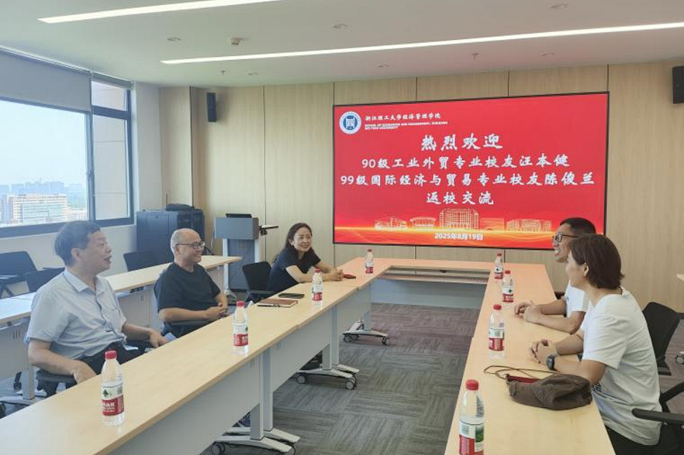 与此同时,义乌校友会会长汪本健、秘书长陈俊兰与经管学院领导进行了座谈交流。双方就国际贸易新形势、人才培养创新、学院40周年院庆合作等议题展开深入探讨,并在加强校企联动、举办院庆专场活动等方面达成共识,为后续深化合作奠定了坚实基础。