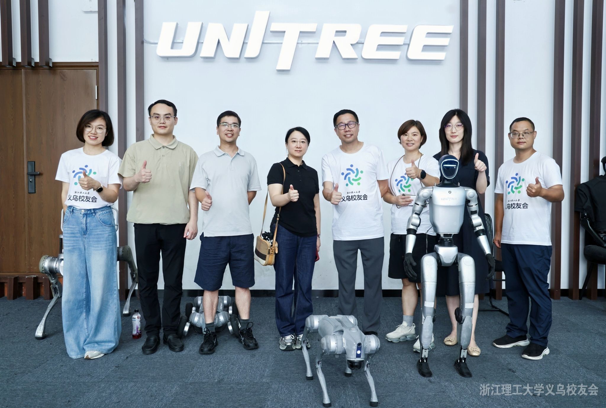 紧接着,大家来到第二家校友企业——宇树科技(Unitree Robotics)。作为全球知名的四足机器人(机器狗)研发公司,宇树科技向大家展示了多代机器狗产品,并安排了丰富的互动环节。孩子们尤其兴奋,与机器狗比赛上下楼、握手等等,现场笑声不断。